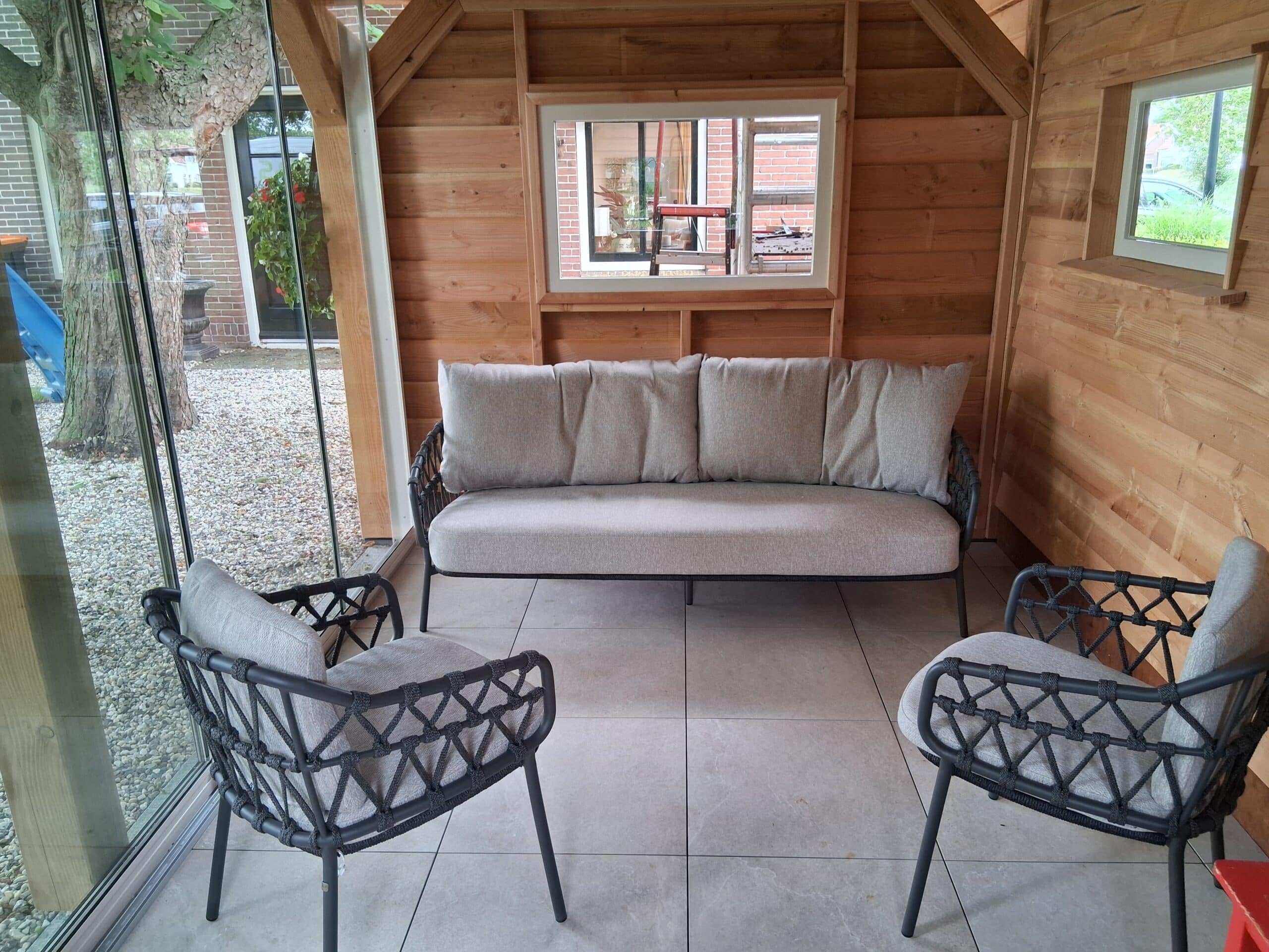 Deze mooie Calpi loungebank en 2 Calpi diningstoelen mogen leveren in Zoeterwoude. In deze overkapping met glas kan het hele jaar genoten worden van deze knusse lounge opstelling. All Weather kussens van stof met afritsbare hoezen verhogen het comfort.