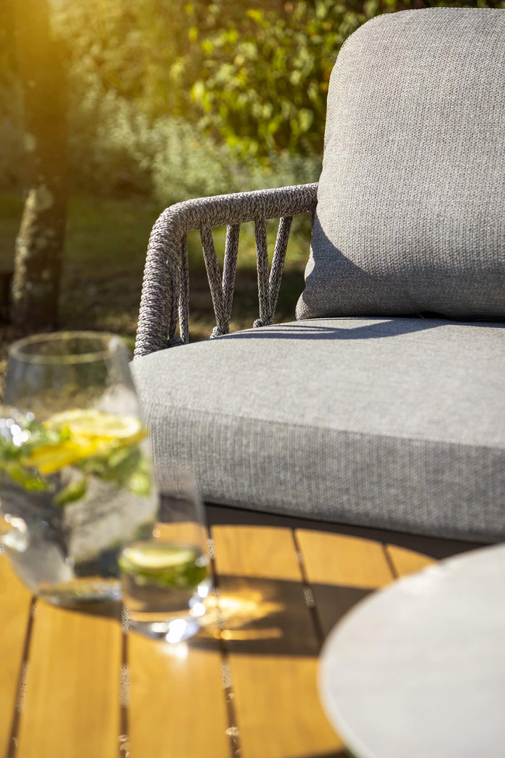 De set bestaat uit twee comfortabele loungefauteuils, een loungebank en twee salontafels – ideaal om gezellig samen te borrelen, te ontspannen of te genieten van lange zomeravonden. De dikke Olefin kussens in warme tinten nodigen uit om lekker onderuit te zakken en zijn bovendien weerbestendig en onderhoudsvriendelijk.
