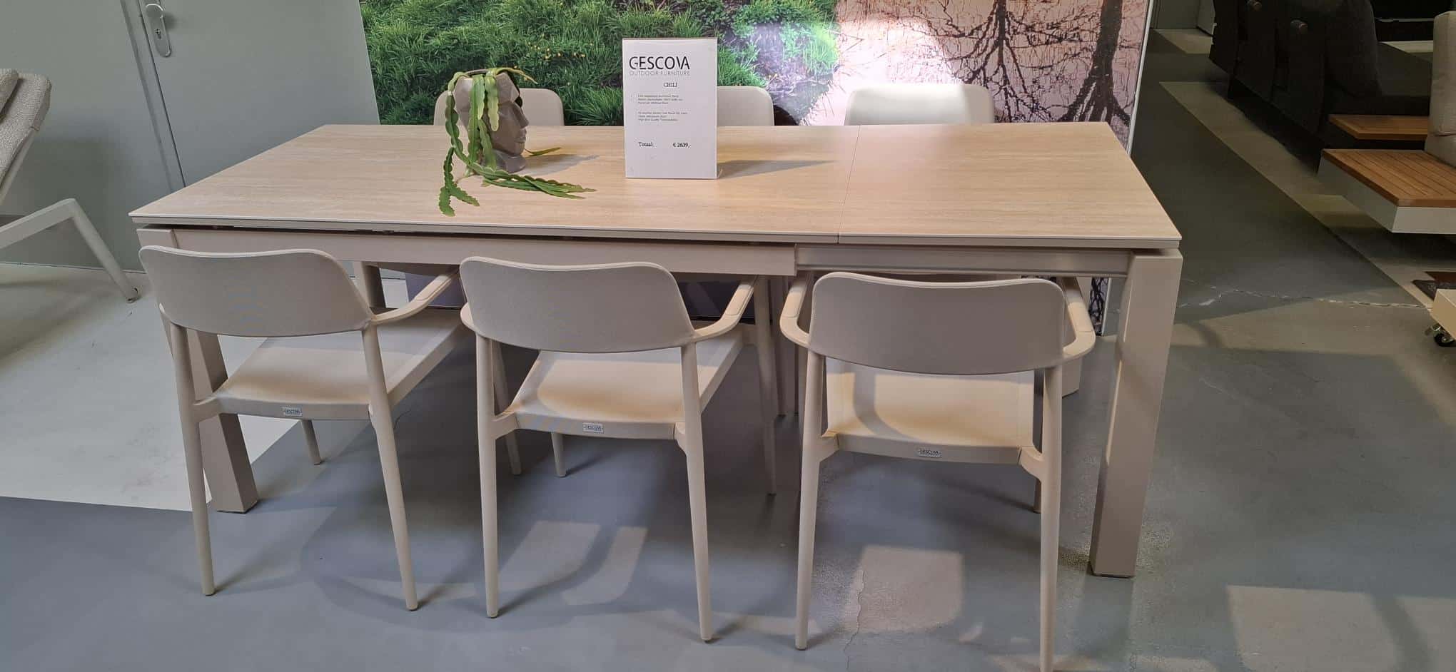 Of je nu geniet van een zomerse lunch in de zon of een sfeervol diner bij zonsondergang, de Gescova Chili Sand diningset met Bettini tafel vormt het perfecte middelpunt van jouw buitenruimte – een harmonieuze mix van design, functionaliteit en comfort.