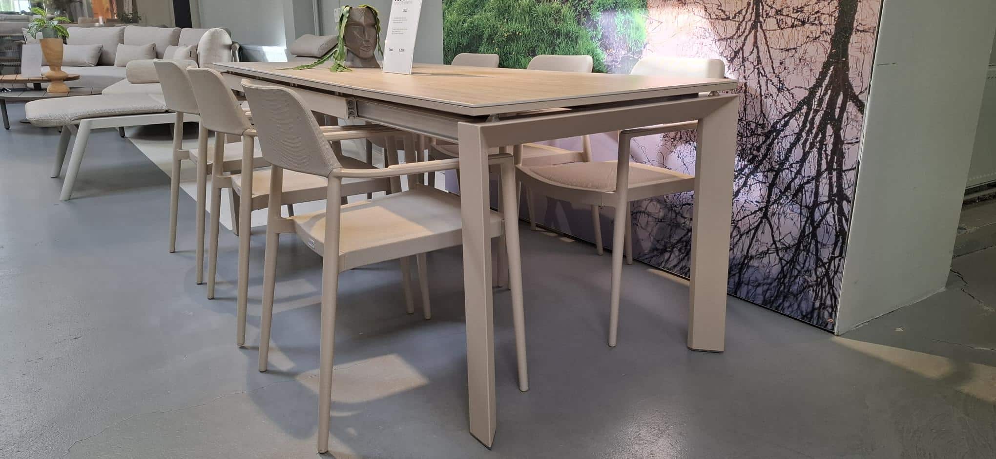 Centraal in deze set staat de Bettini uitschuifbare tafel, voorzien van een hoogwaardig keramiek Sand blad. Dit blad straalt niet alleen luxe uit, maar is ook bijzonder praktisch: krasbestendig, onderhoudsvriendelijk en bestand tegen diverse weersinvloeden. Dankzij het slimme uitschuifmechanisme transformeer je de tafel in een handomdraai, zodat je altijd voldoende ruimte hebt voor extra gasten.