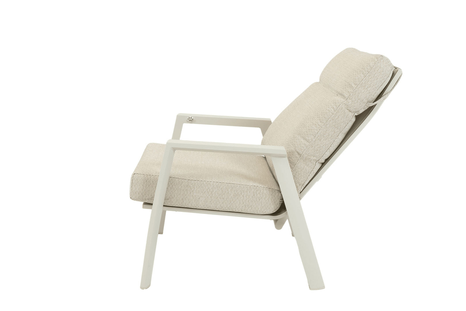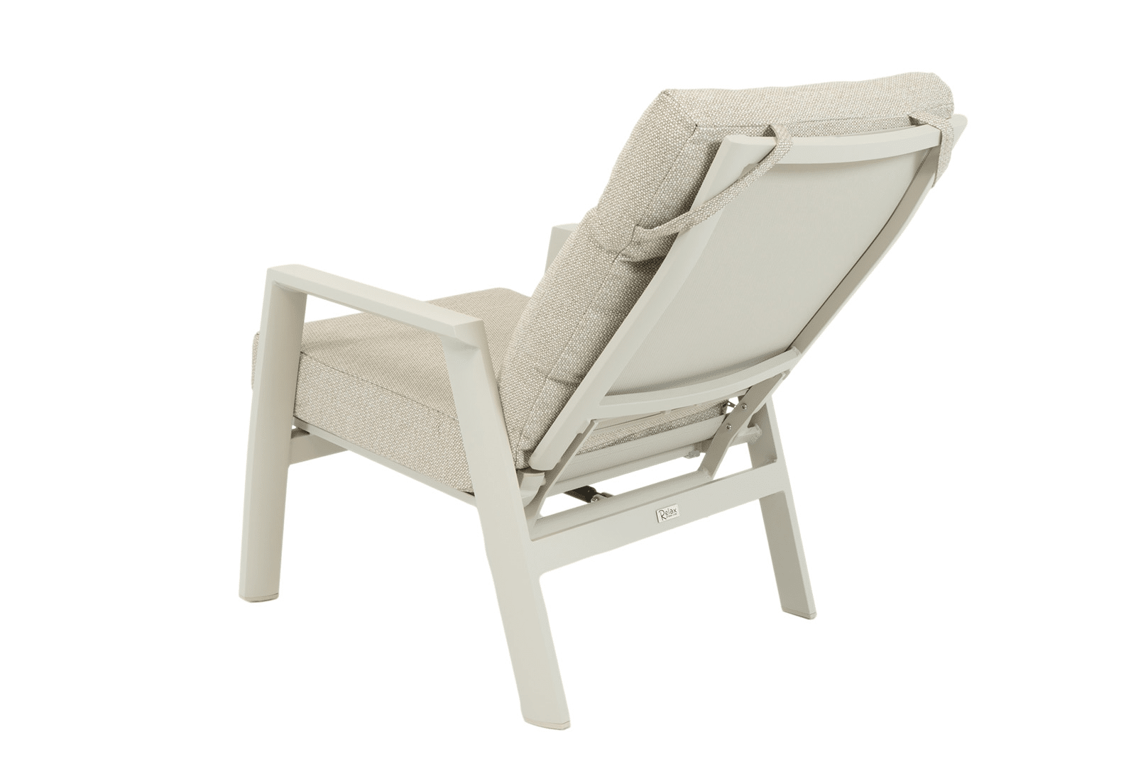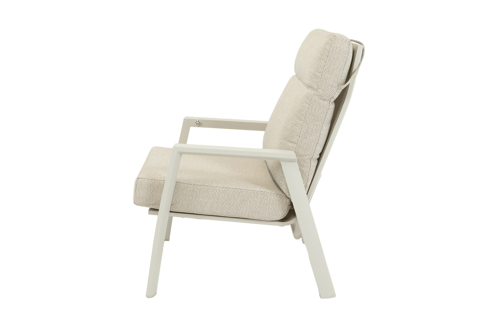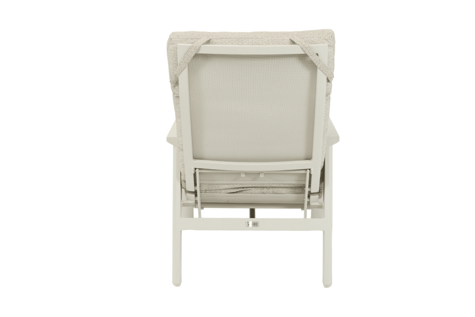 Met de traploos verstelbare rugleuning, bediend via een soepele gasveer, stel je de ideale loungepositie in. De extra dikke All Weather kussens zorgen voor een heerlijk zacht zitcomfort, zelfs na een regenbui.