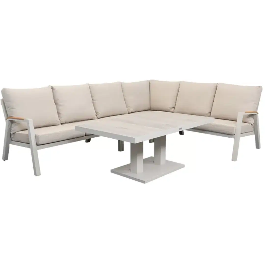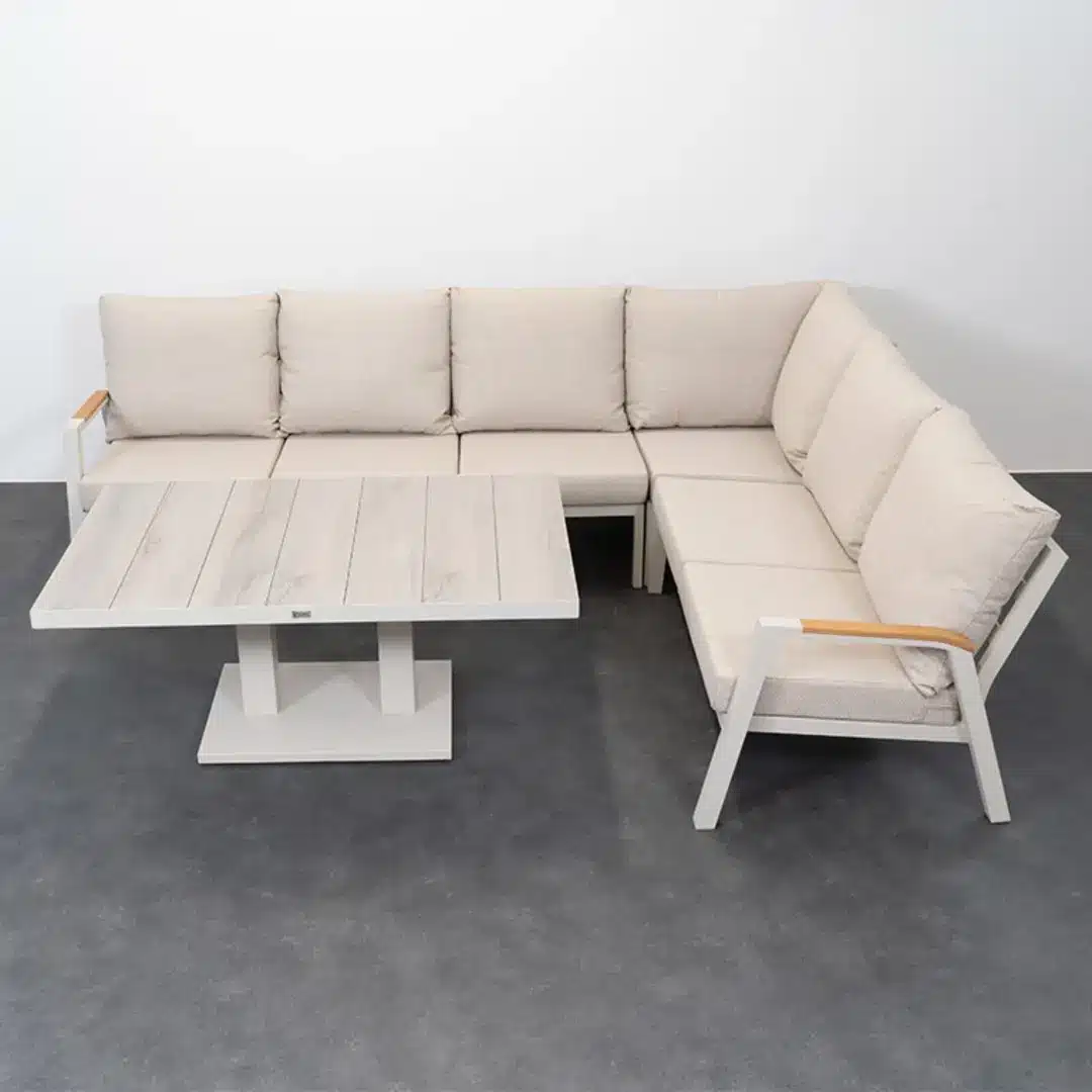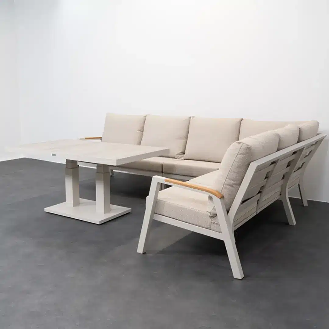 Laat je terras schitteren met de Sumatra hoek loungeset in de kleur champagne – een stijlvolle blikvanger die luxe en comfort moeiteloos combineert. Het elegante aluminium frame, hoogwaardig gepoedercoat voor optimale bescherming, zorgt voor een moderne look én jarenlang zorgeloos buitenleven.